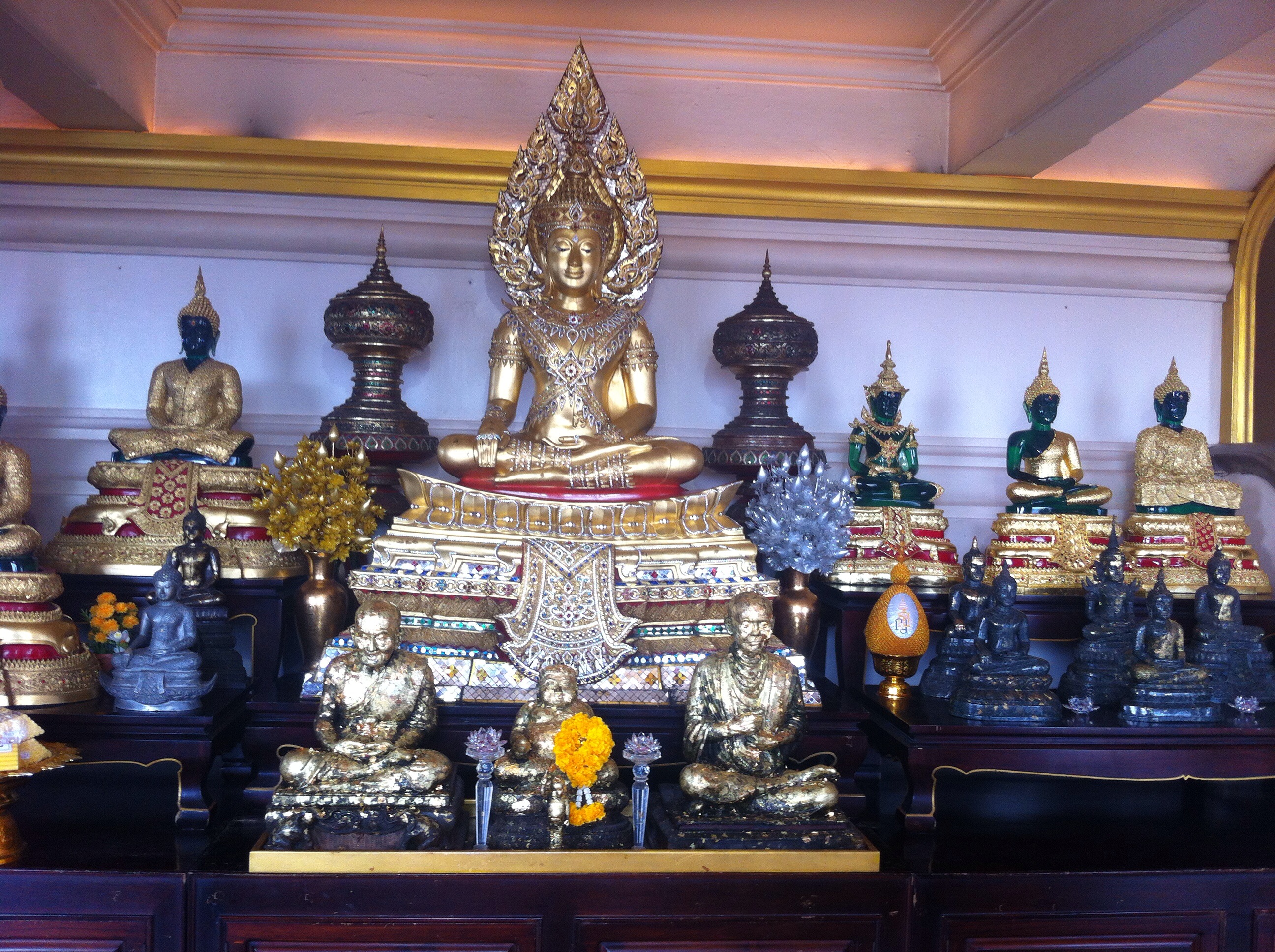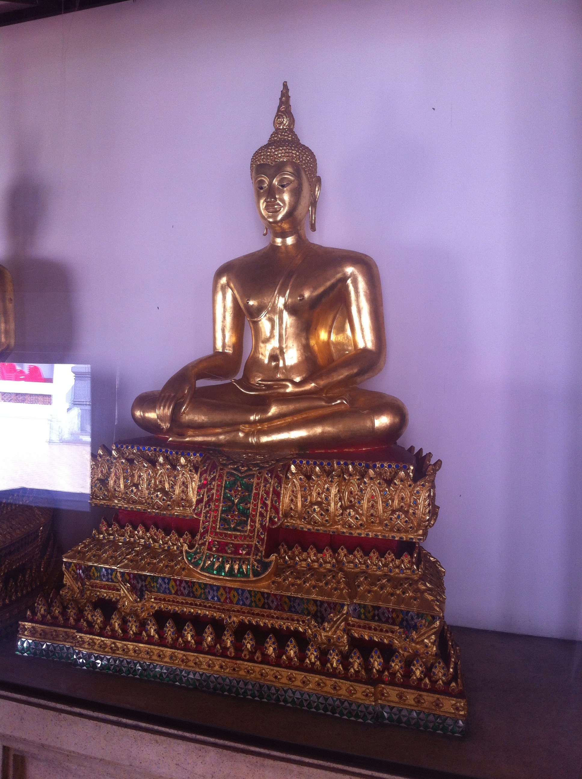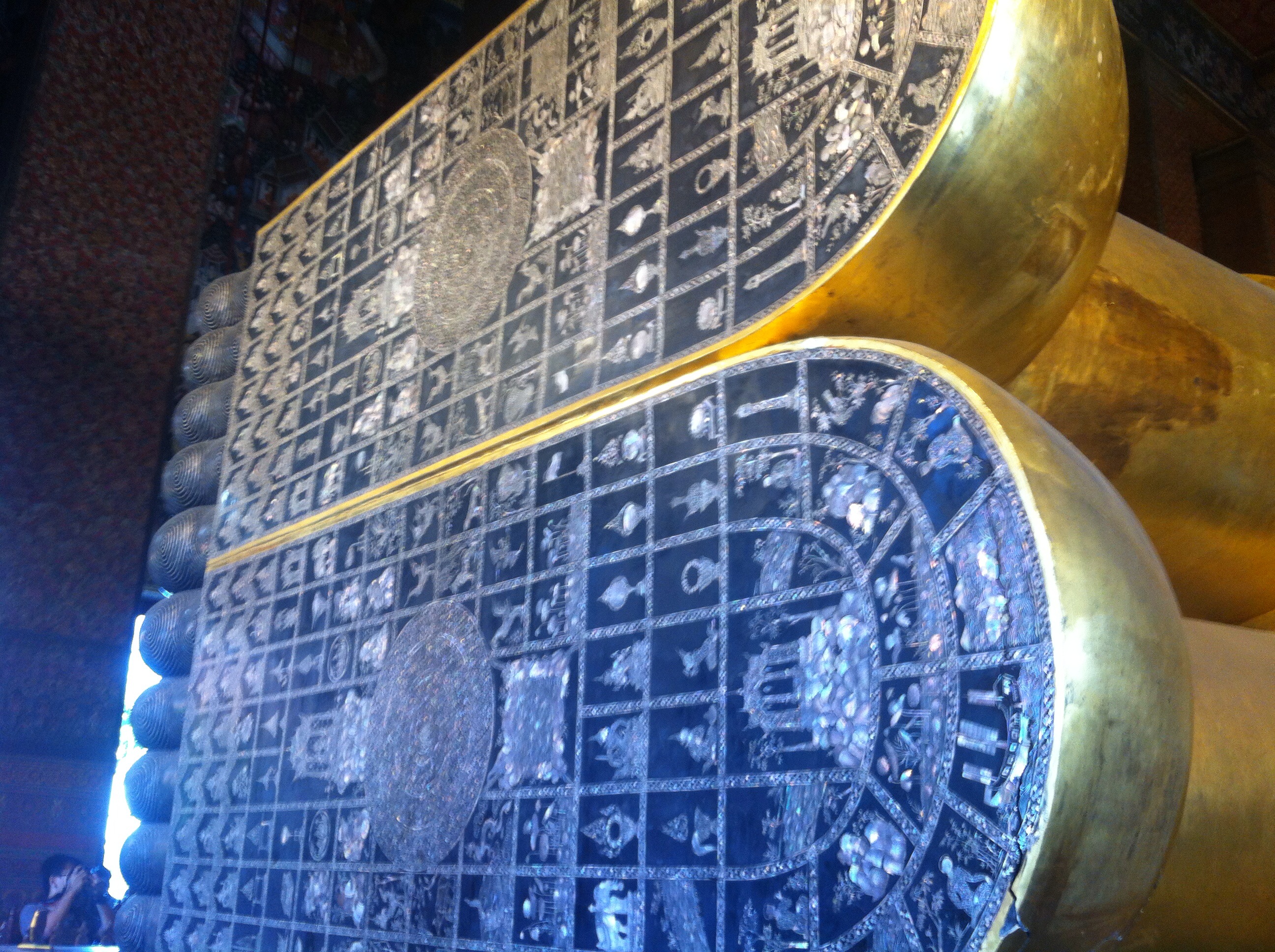 The Reclining Buddha. Witnessed the ritual of sticking gold leaf on statues making them look like they flicker.